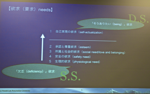 マズローの欲求段階説(上図)で見てみると、下の4つの欲求(「欠乏」欲求)は、計量化もできるし可視化もできるが、最上位の自己実現の欲求(「そうありたい」欲求)は、本人すらわかっていないところであり、ここに対してゲーミフィケーションで何かを働きかけるというのは、非常に難しいことなのだという。
