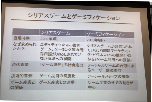 第一に、「エデュテインメント~シリアスゲーム~ゲーミフィケーション」というゲーミフィケーションの歴史的な経緯についてである。藤本氏は、それぞれの登場時期と背景について簡明に整理した。その中でも特に、以下のスライドに示されたシリアスゲームとゲーミフィケーションの違いについてはしっかりと押さえておきたい。
