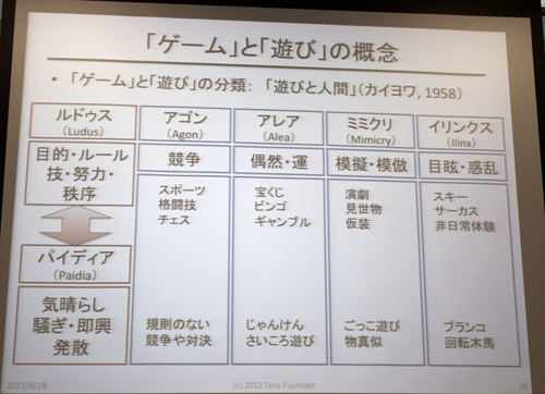 藤本氏はカイヨワの『遊びと人間』で分類された「ゲーム」と「遊び」の違いを以下のようにまとめた。スライド上部の「ルドゥス(Ludus)」がゲームフル(ゲーミフィケーション)の領域であり、下部の「パイディア(Paidia)」にカテゴライズされるものがプレイフルに当たると説いた。