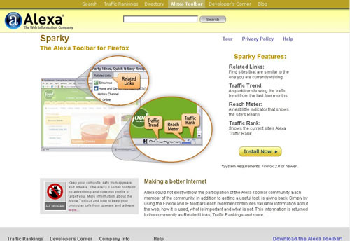 Sparkyは正式名称が"The Alexa Toolbar for Firefox"(Firefox向けアレクサ・ツールバー)であることから、Firefoxユーザに対してアレクサ・ツールバーの機能を提供するものです。また、ブラウザへの組み込みも、ツールバーという形式ではなく、機能追加のためのアドオンの仕組みに従っています。
