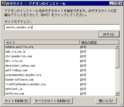 「設定を変更」を押して、Sparkyの配布ドメイン"sparky.mozdev.org"を許可サイトに追加して、再度インストールを試みる必要があります。