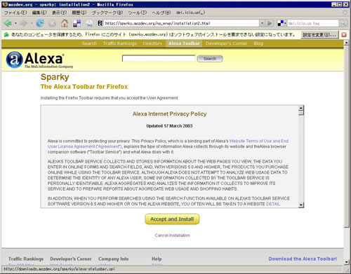 FirefoxでAlexaトップページにアクセスしたときに出るSparkyの案内