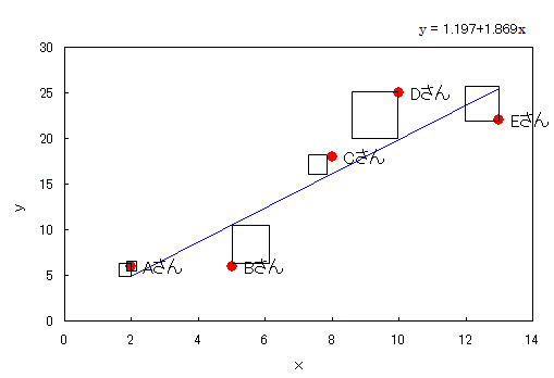 誤差を二乗することは、正方形の面積を求めることになります。最小二乗法では、この5つの正方形の面積(誤差の二乗和)が最小になるように、傾きa、切片bを求めるものです。