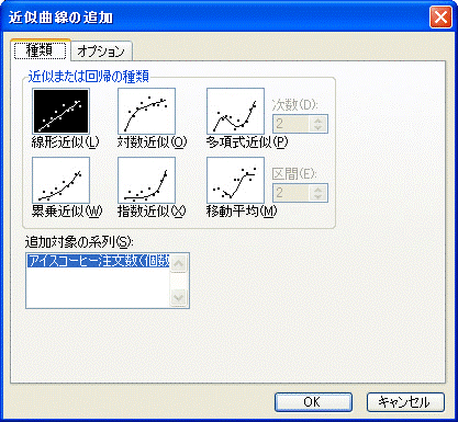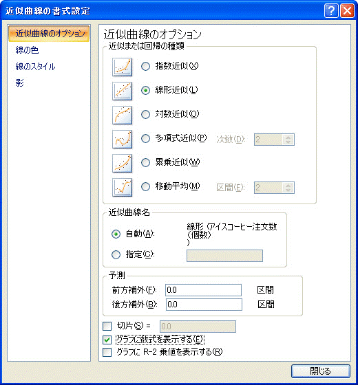 Excel2003の場合は、[近似曲線の追加]の[種類]で[線形近似]を選択し、