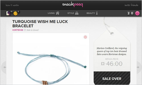 それに近いかなと思うサービスが「SneakPeeq」。オープンから3週間で1万ユーザを獲得したゲーミフィケーション要素をちょっぴり取り入れたeコマース。人の「欲しい」が集まれば集まるほど価格が安くなる仕組みで、商品ページに記載があるのは元の価格だけ。現在の価格をチェックするには「ピーク」(覗く)必要があって、1日に許されるピークの回数は20回。商品がピークされた回数、お気に入りされた回数、Likeした人の顔などが表示されていて、人気商品が一目でわかる。リアルタイムに、いま誰々がピークしましたなんて情報も出るためショップで買い物するのに近い感覚が味わえる。