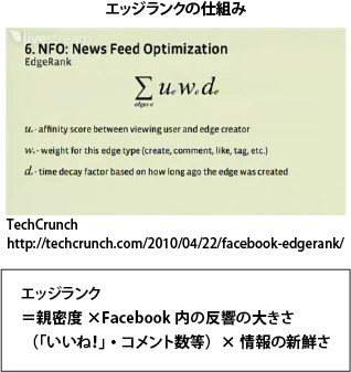 また、Facebookでは友人でいるだけではニュースフィードに更新内容が表示されなくなることがあります。Facebookには、合計250件を超えると、交流がない友人やFacebookページの情報は表示されづらくなるという仕組みがあります。この表示するかどうかを決定するアルゴリズムは、「エッジランク」と呼ばれます。エッジランクは、相手から「いいね!」やコメント、シェア等されることで高まりやすくなります。