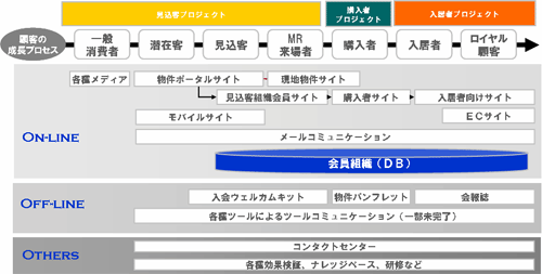 ところが、本事例の企業では、なんとモデルルーム来訪者の20%以上が契約しているのです! その秘訣は、モデルルーム来訪者の早期囲い込み(会員化)と細やかなケア(情報提供)。会員には、ハイクォリティのマンション案内を送付するだけでなく、個別情報のやり取りも可能な会員専用サイトを解説してコミュニケーションを途絶えさせないなど、さまざまな工夫がなされているのです。さらに、会員、未入居者(完成待ちの契約者)、入居者と3種類のステイタスを設定し、それぞれに必要な情報を提供するシステムを作り上げました。たとえば、モデルルーム来訪者から会員になったばかりの方には、その物件だけではなく、会員の住所に近い類似物件を推薦するなど、大きな視点から会員をフォローしているのです。