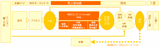 見込み顧客と入居者には、デジタルと紙の連動でトータルなケアが行われていることにお気づきだと思います。その当時、見込み顧客会員はWeb入会とハガキ入会で「2:3」の割合になっており、必ずしも全員がインターネットを利用しているとは限りませんでした。そこで、リアルとバーチャルの2つの媒体をラインナップし、必要情報がすべての顧客に届く工夫を施したのです。