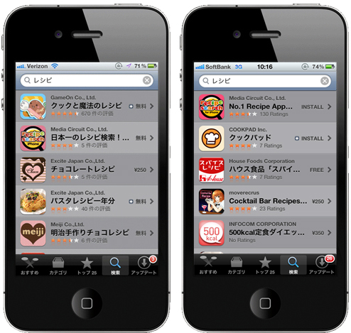 ところが、今回の変更以降、App Storeで「レシピ」というキーワードで検索すると、クックパッドのアプリが2位(8月31日現在)にランクイン。どうも今回の変更で、以前に比べて人気アプリが検索結果で上位に出るようになったみたい。