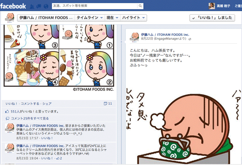 たとえば伊藤ハムのFacebookページでは、キャラクターのハム係長の「こんにちは、ハム係長です。今日は“ノー残業デー”なんですが……。お給料前でとっても厳しいです。ぷふぅ~っ」という投稿には、791件の「いいね!」と64件のコメントという、普段よりも数割以上多い「いいね!」とコメントがついています。