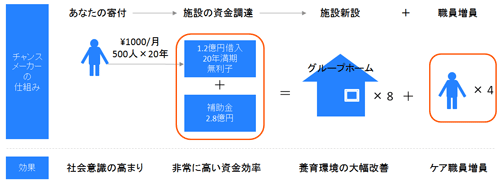 国内向けプロジェクトとしては、児童養護施設支援の「チャンスメーカー」という継続型クラウドファンディングを展開している。