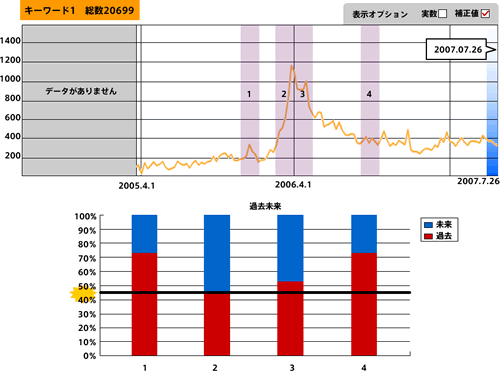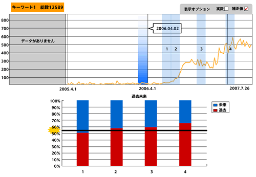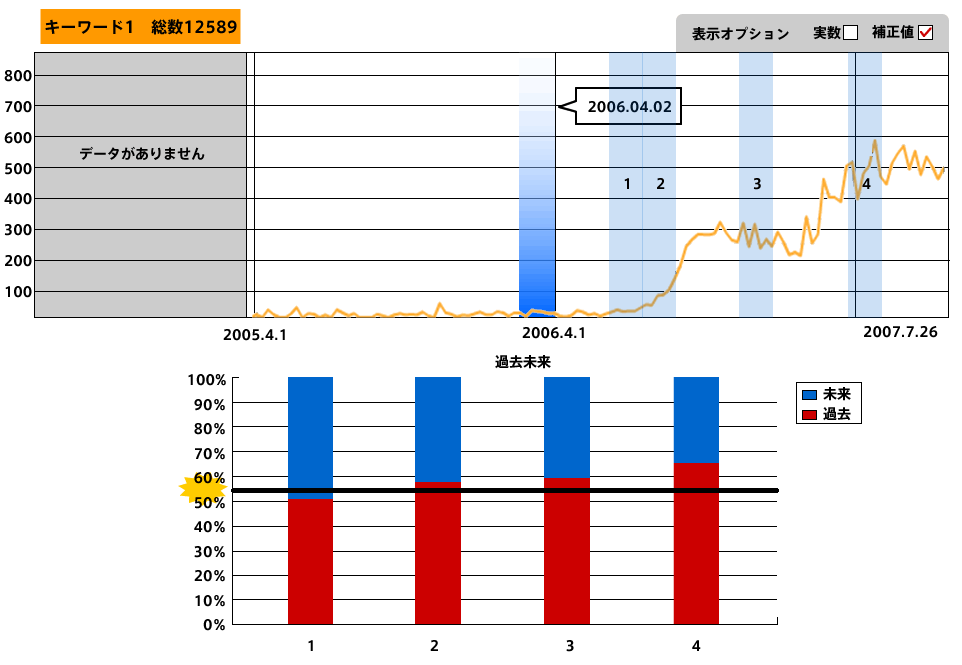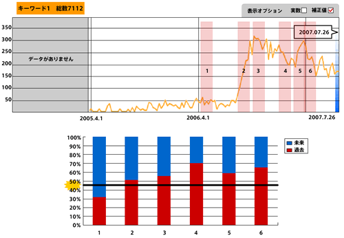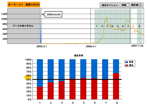 それぞれ、グラフが跳ね上がることと比例して過去語(「買った」「買いました」)が増えている傾向にあることがわかる。流行中の3アイテムに共通の動きが見られるわけだが、では、流行が終わっているカチューシャはどういった動きをしているのだろうか?