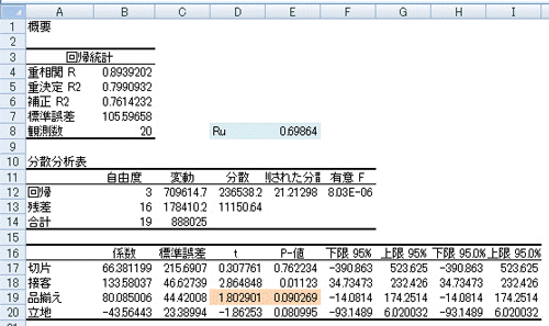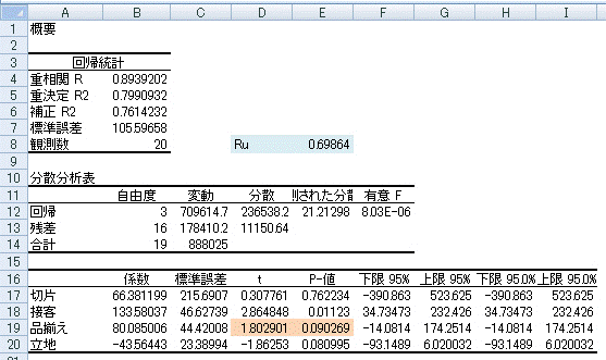 Ruの値が大きいのは、2回目の「接客」「品揃え」「立地」の3つの説明変数の場合であり、この組み合わせが、より精度の高い重回帰式であることを示しています。