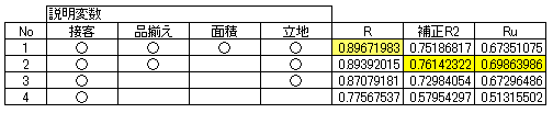 表の見方は、No1は、説明変数を4つすべて採用した時の、重相関R、補正R2、そしてRuの数値です。見るべき項目は、変数選択基準のRuですが、参考までに重相関R、補正R2の値も載せています。重相関Rが精度を測る指標として使えない理由は後述します。