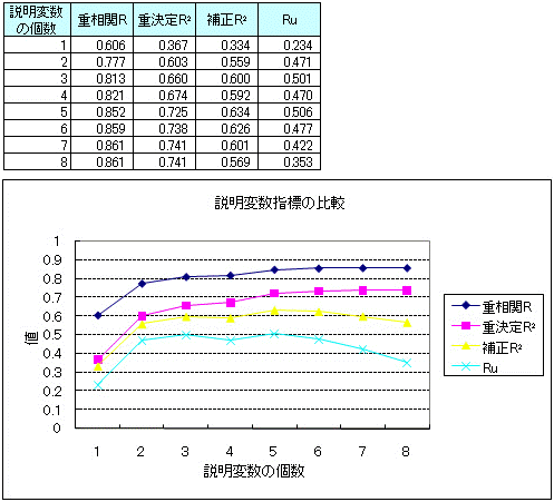そこで、説明変数の数による影響を排除した指標が、補正R2や上田の説明変数選択規準Ruになります。今回は、Ruを使いましたが、補正R2(正確には、自由度調整済寄与率)を利用しても構いません。補正R2もRuもほぼ同一の結果になりますが、場合によって(特にデータ数が少ない時)、補正R2の方がより多く説明変数を採用する傾向があります。
