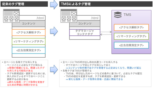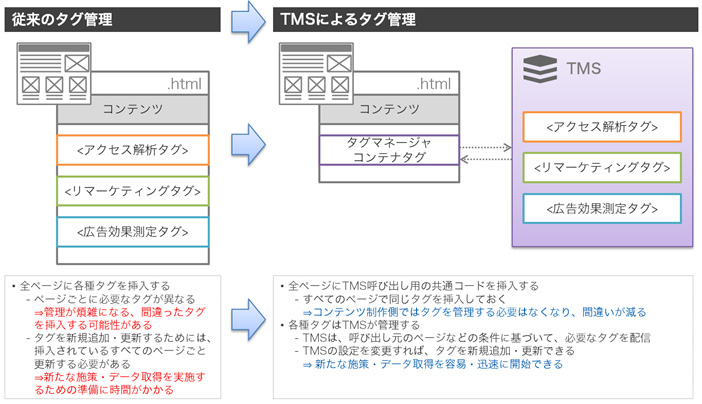 そこで、WebサイトのHTMLコードから解析タグを分離し、別のシステムで一括管理するのがタグ管理システム(Tag Management System; TMS)です。タグ管理システムを使うと、以下のようなメリットがあります。