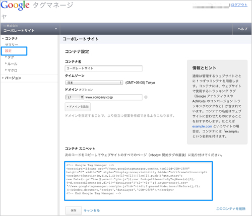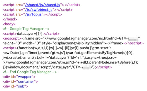 設定が完了したら、コンテナタグをWebページに埋め込みます。コンテナ設定画面に表示されるタグを、すべてのページの<body>タグの直後に挿入します。