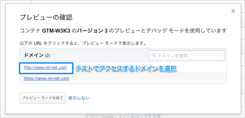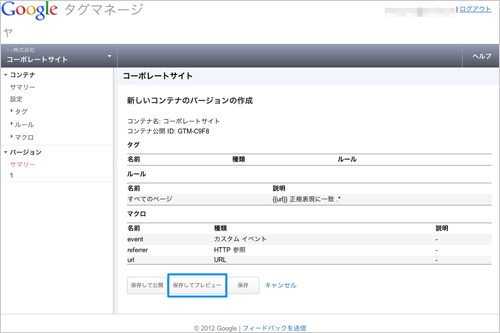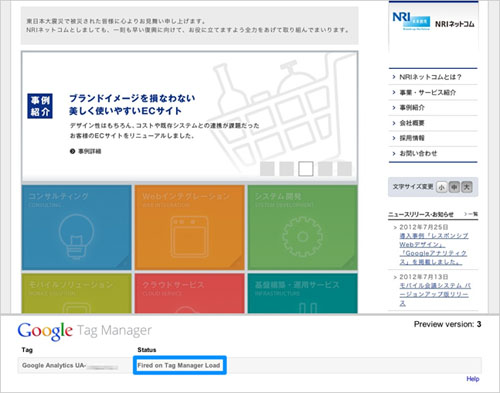 保存後、タグの移行が完了したことを確かめるため、Google Tag Managerのプレビュー機能を使って、実際にWebサイトを表示しながら、各解析タグが正しく呼び出されているか確認します。