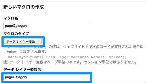 次に、pageCategoryをGoogle Tag Managerのマクロとして定義します。コンテナのサマリー画面から、「新しいマクロ」ボタンをクリックし、下記のように指定します。