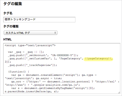 次に、Googleアナリティクスのトラッキングコードを登録します。カスタム変数を使用するため、「タグの種類」には、「カスタムHTMLタグ」を選択し、トラッキングコードを貼り付けます。カスタム変数の値には、「{{pageCategory}}」と入力しておきます。このように、マクロ名を{{ }}でくくると、実行時にマクロの値に展開されます。