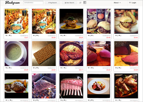 Instagramを活用したプロモーションに欠かせないハッシュタグ。そのハッシュタグをウェブで検索できる。レストランメニューの#comodomenuで検索すると、こんな感じ。(http://hashgr.am/)