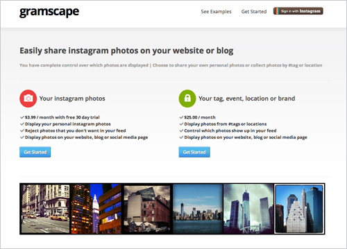 Instagramの写真をブログやウェブサイトに埋め込んで表示できる。個人利用なら月額3.99ドル(30日間のトライアルつき)、プロモーションなどに使いたい法人は月額25ドルで使えるそう。(http://gramscape.com/)
