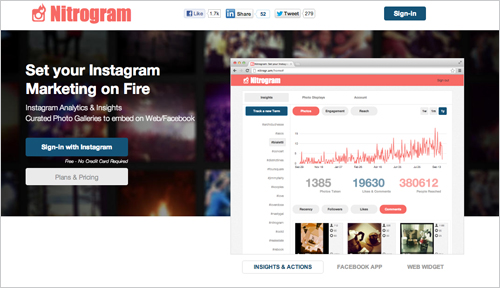 Instagramのアナリティクス・ツール。月額料金は、無料、10ドル、49ドル、349ドルの4パターン。ウェブサイトやFacebookへの埋め込みツールも提供。 (http://nitrogr.am/ )