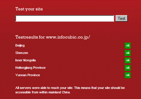 各地域ごとに緑の「oK」が表示されれば、中国でも閲覧可能なサイトとだとわかります。