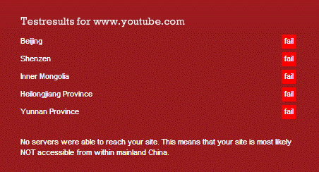 このサイトで「fail」だった場合、コンテンツ自体に規制がかかっている場合があるため、基本的にはサイトの内容を変えるしか解決案はありません。このような場合は、中国のユーザーがサイトを閲覧できないため、中国向けにWebマーケティングが実施ができなくなってしまうということもありえます。