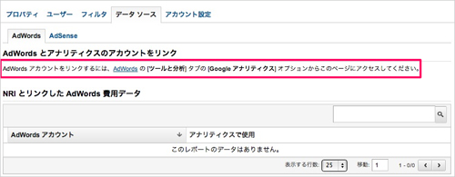 (3)のGoogle アナリティクス と Google AdWords の2つのツールのアカウントのリンクですが、これにはアナリティクス、AdWordsの両方の管理者権限をもつGoogleアカウントが必要になります。管理者権限かどうかは、各ツールの管理画面で確認できます。リンクができていない場合は、Google アナリティクスの管理画面上で下記のメッセージが出ます。