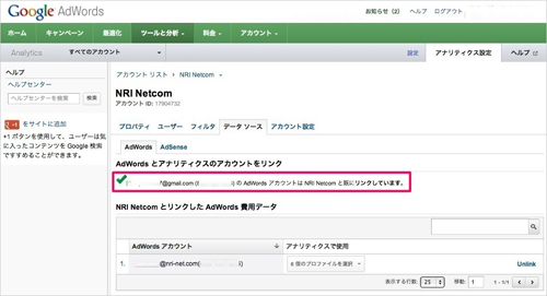 リンクが完了すると下記画面になり、リンク済のメッセージに変わります。これで、Google アナリティクス と Google AdWords のリンクは完了です。
