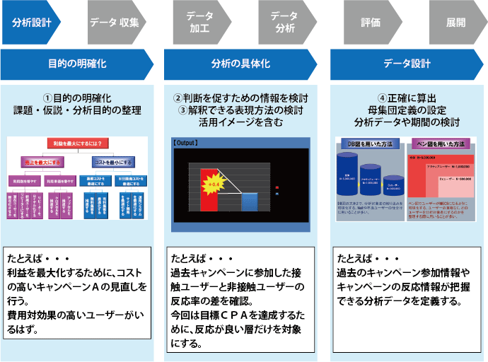 データ活用のためには、可視化した数値により施策の実施判断や設計に活用できるかを、具体的にイメージしておくことがポイントとなります。分析設計ができるか、これが分析者にとって重要なスキルと言えるでしょう。