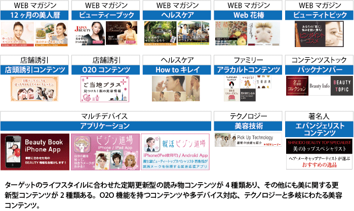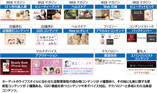 違います。美容コンテンツはマルチユース、マルチターゲットでの展開を進めております。美容コンテンツは弊社の核になるコンテンツですので、ターゲットで切り分けるよりも誰もが接触可能なマルチユースでの利用が重要と考えております。定期更新型の読み物、ハウツーものの他にも店頭誘引を促すためのコンテンツやスマートフォン対応コンテンツなど多岐にわたって美容コンテンツを発信しています。