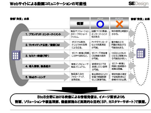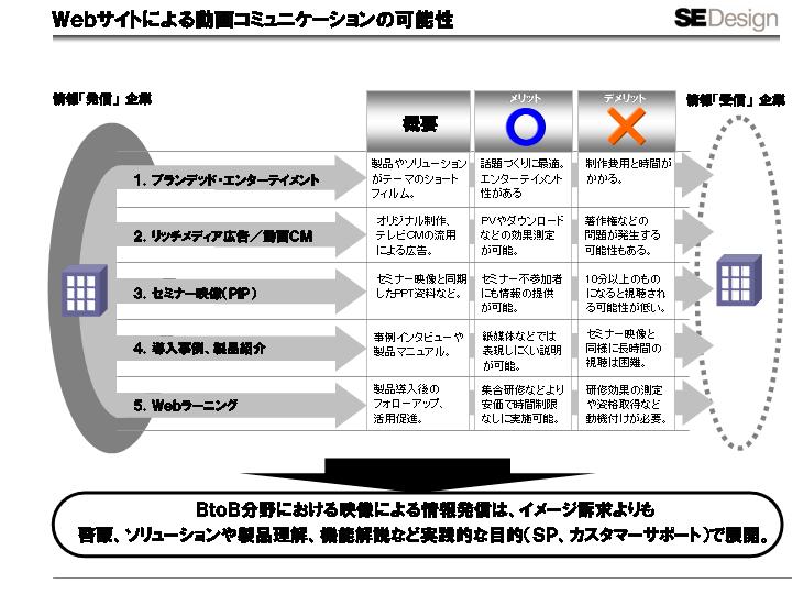 最後に、企業の映像活用についての事例を一枚にまとめてみました。今回はWebサイトで映像によるコミュニケーションを検討している企業を想定します。当然、メリット、デメリットがありますが、敷居が低くなり、チャレンジできる環境が整ってきていることは確かだと思います。