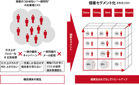 「実態のつかめない“一律同列”のお客様リスト」を「個客別でセグメント化されたリスト」として、個客別のおもてなしを実現し、リピートをアップさせていきましょう。
