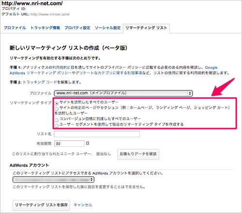 次に、リマーケティング タイプを指定します。ここは、今回の作成手順で一番重要なポイントになります。リマーケティング タイプは以下の4つから指定できます。