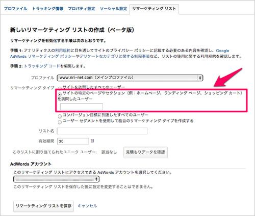 最初にGoogle アナリティクスの対象プロファイルを指定するプルダウンメニューが表示されます。リマーケティングタグを設置済みでリマーケティングを実施する対象サイトのGoogle アナリティクス プロファイルを選択します。