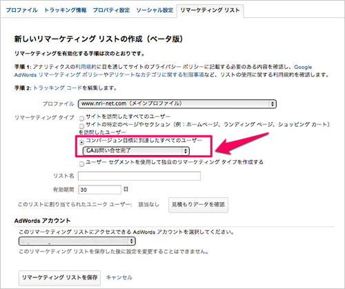 コンバージョン目標に到達したすべてのユーザーを対象にする場合に選択します。コンバージョン目標とは、Google アナリティクスで設定する目標のことです。このリストタイプを指定するには、Google アナリティクスで「目標の設定」を事前に実施する必要があります。事前に目標を設定している場合、ここにプルダウンで目標が表示されますので選択します。
