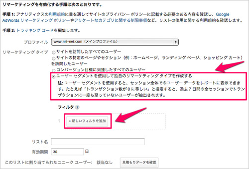 • ユーザー セグメントを使用して独自のリマーケティング タイプを作成する