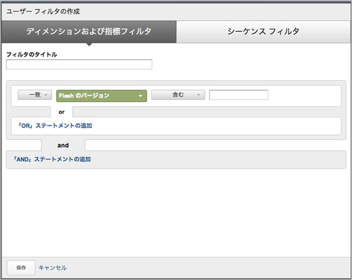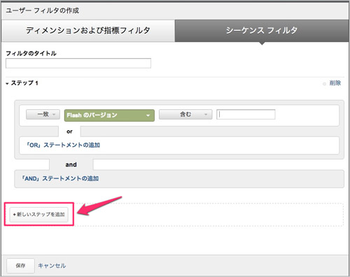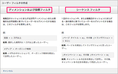 「ディメンションおよび指標フィルタ」「シーケンスフィルタ」のいずれかを選択します。どちらもマルチセッションデータを使ってユーザーをセグメントできます。どちらもセグメントするために、ディメンションと指標を指定することには変わりありませんが、「シーケンスフィルタ」はステップ(順序)を指定できる機能を持ったフィルタです。