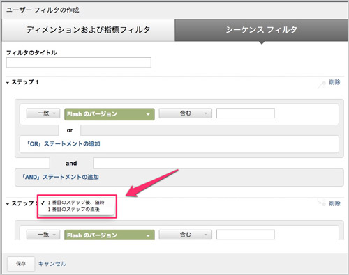 シーケンスフィルタを選択した場合は、マルチセッションにおけるステップ(順序)を指定します。 「シーケンスフィルタ」のステップについては、ステップの前後の間隔についても指定できます。