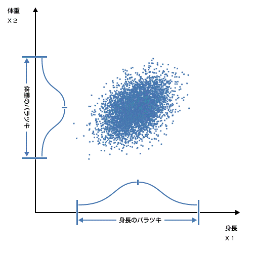 横軸は、身長の分布、縦軸は体重の分布を表しています。このグラフを見ながら、首を左に傾けてグラフを眺めるとちょっと世界が変わって見えませんか?