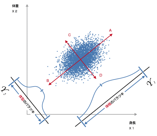 たくさんの情報を持つ散布図空間の中で、まずデータのバラツキが最大の方向(AB)を見つけ、それと直交(垂直に交わる)しながら、バラツキがその次に大きい方向(CD)を見つけることによって、データの持つ情報を効率的に理解することができます。このような新しい軸を見つける分析手法、これが「主成分分析」です。