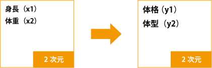 ここで重要なのは、身長と体重が測定されたデータであるのに対して、体格と体型という新しい変数は加工されたデータである、ということです。今回は2 次元のデータなので、あまりありがたみがありませんが、複数の変数がある場合、少ない次元で情報を要約できればデータの構造・特色が非常にわかりやすくなります。