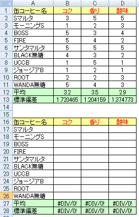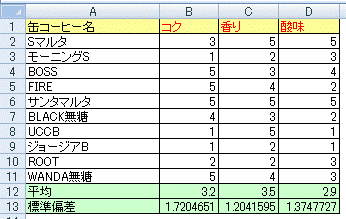 1.生のデータの「コク」「香り」「酸味」のそれぞれの平均値、標準偏差を求めておきます。