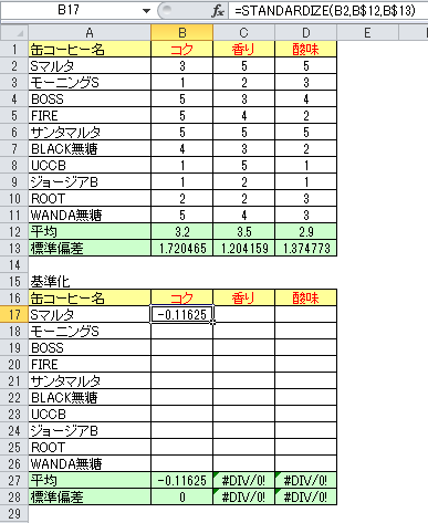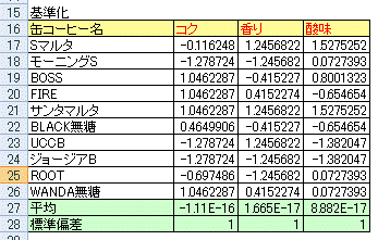 それでは、いよいよ缶コーヒーのデータを基準化していきます。