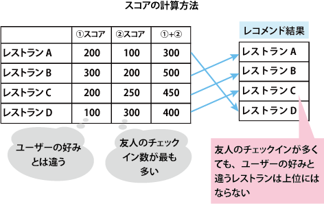 ここでのポイントは、前述したとおりソーシャルでのチェックイン数ランキング、すなわちソーシャルグラフ・ランキングではなく、ユーザーのチェックイン履歴にもとづいて嗜好も考慮されレコメンドされていることです。