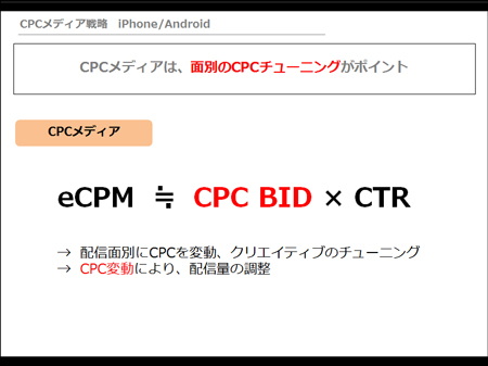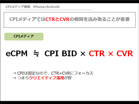 一方、アメリカではCPI(インストール課金/Cost Per Install)のサービス利用がトレンドです。インセンティブは付与せず1インストール当たりの単価が決まっていて、アプローチする在庫や配信面は、CPCメニューと変わりません。現在アドネットワークは、CPI課金が主流になってきています。CPIメニューなのでインストール単価が単一とあんるので、CPCとは違い、細かく入札を変えないメニューのため、eCPMのコントロールはCTRとCVRになります。