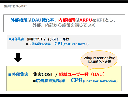 そこで、私たちが推奨しているKPIは「 CPR(Cost Per Retension/一人当たりの継続率)」です。CPIはインストール当たりの獲得単価ですが、CPRはリテンション、つまり継続ユーザー当たりの獲得単価をKPIとしています。いくら使って、何人のDAU(Daily Active User/一日あたりのアクティブユーザー数)を獲得できたのかを経営判断として用いる事によって、広告集客における最適化を行っています。