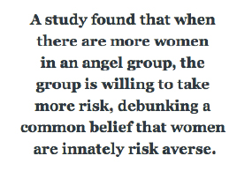 投資家グループに占める女性の割合に関する記事によると、2005年、女性ばかりのエンジェル投資家グループはエンジェル市場の8.7%だった。5年後の2010年には13%に上昇。リスクが伴う投資分野で女性がより活発になってきていることがわかる。さらに、メンバーの大半を女性が占める投資グループの方が、男性のみの投資グループに比べてリスクがより大きな案件に投資する率が高いんだとか。